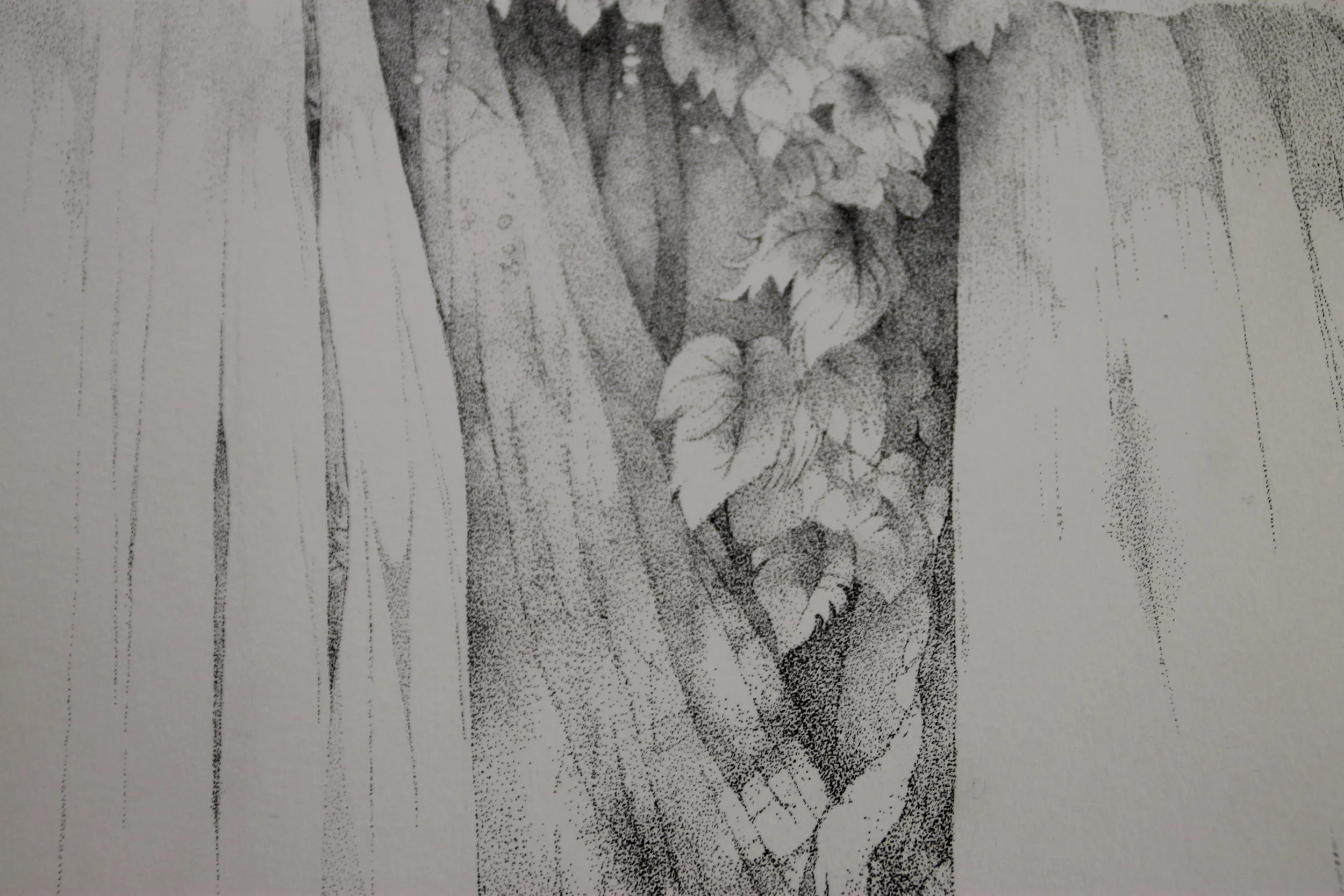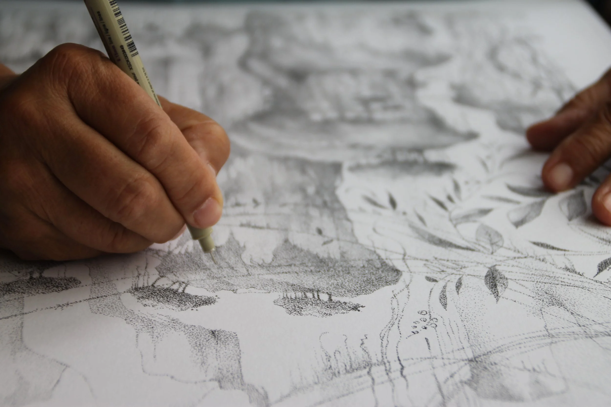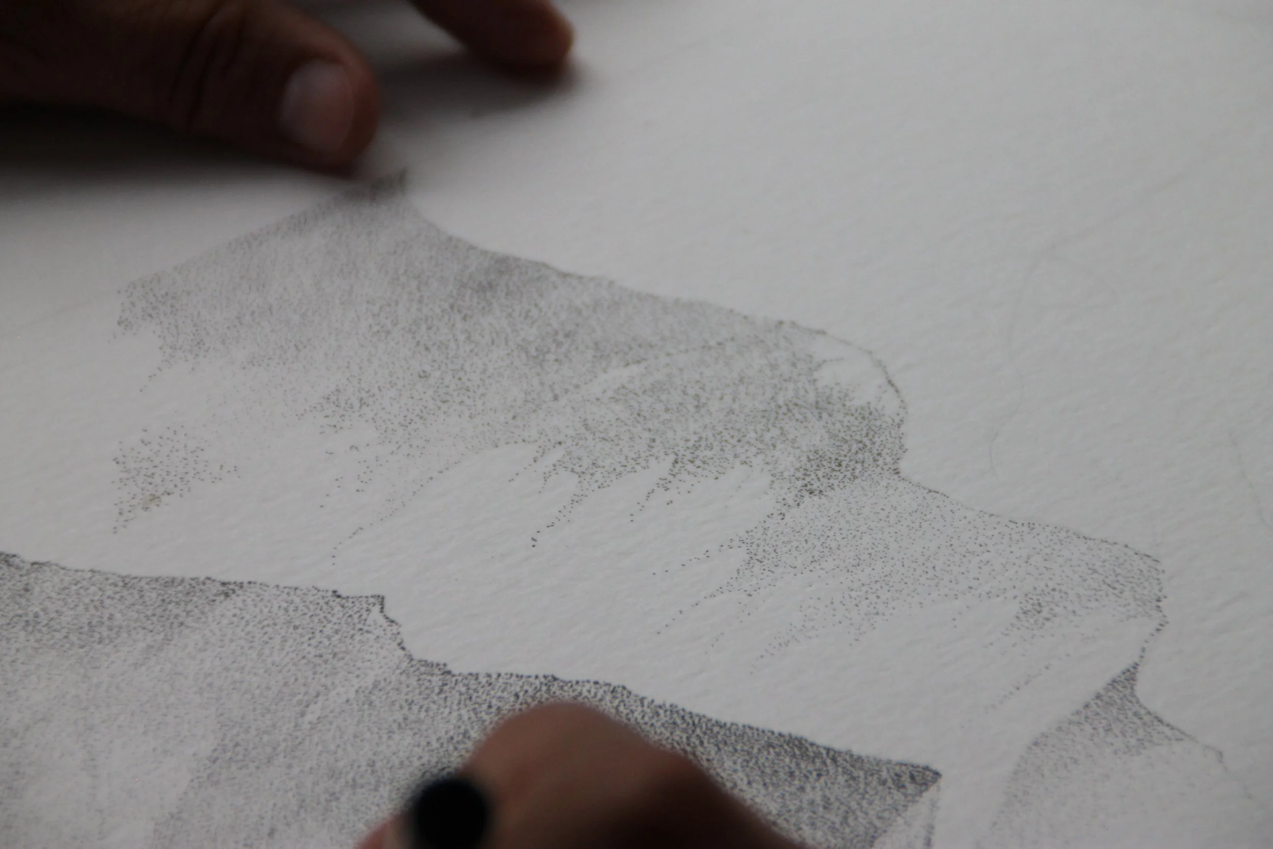 Discover the interplay of light and shadow through the meticulous application of black and white pointillism